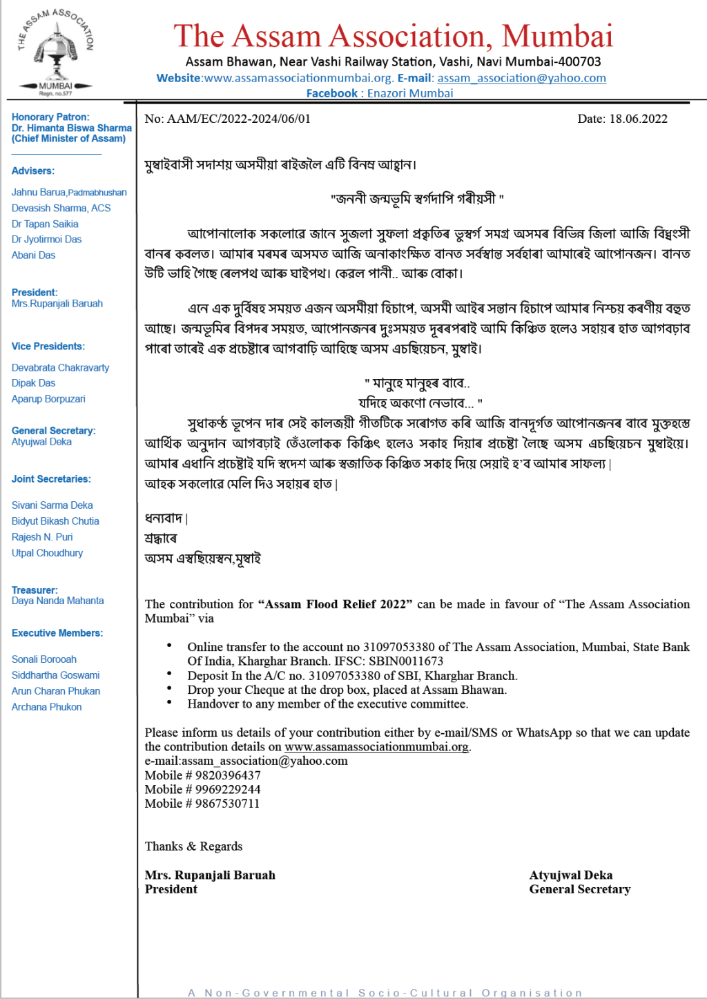 Support our relief efforts by transferring funds in favour of “The Assam Association, Mumbai”: